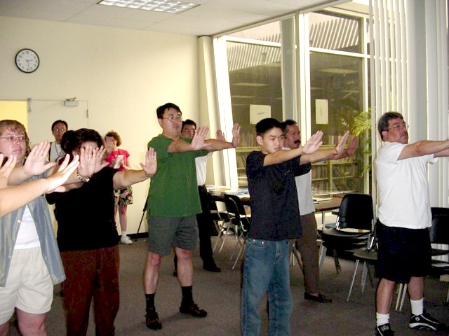 下午2点,在图书馆的一间会议室,当地居民饶有兴趣地观看了法轮大法的介绍及学员修炼体会的录像片,之后他们称赞了大法的奇妙并问了有关身体健康的问题。在接下来的教功示范上,当地居民极认真地学习了五套功法。来自报社的采访记者被法轮功的法理及五套功法所吸引,也跟着炼了起来。回荡着优美炼功音乐的会议室里一片祥和。