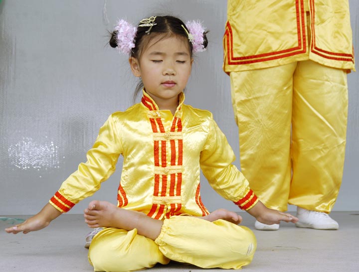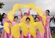 法轮功学员作为第一个节目上台表演了五套功法,扇子舞和打腰鼓。赢来观众一片喝彩。