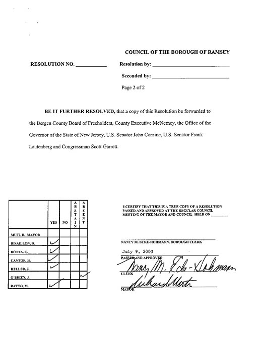 该决议的副本同时抄送伯根(Bergen)郡董事会,郡执行官迈克纳尼(McNerney),新泽西州长办公室,美国参议员约翰-科茨尼(John Corzine),美国参议员法兰克-洛腾伯格(Frank Lautenberg)和众议员斯科特-嘉瑞特(Scott Garrett)。