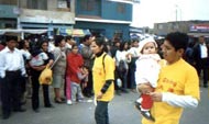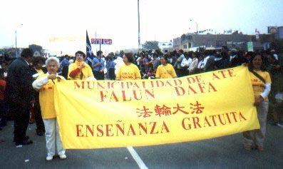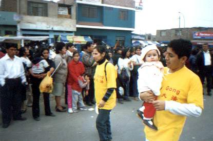 出发前,一位老太太走到我们的前面,要求和我们在一起。她是土生土长在秘鲁的华裔。希望能穿上我们印有“法轮大法”“真 善 忍”中西文字样的黄T恤。老太太高兴地着装后,拿着横幅一直走在队伍的前面。观看游行的人,像似倾城而出,人山人海。我们队伍一直播放着“普度、济世”等大法音乐。学员们边走边向两边发放传单。醒目的着装,祥和安宁的队伍吸引着无数双好奇的眼睛,人们在寻找着从来没有听过的优美音乐从哪来?凝听来自主席台上的介绍,争先恐后地要传单。一位站在路边的先生,用粤语向大法学员打招呼,然后用西班牙语告诉大法学员他是中餐馆的。他虽然不太会讲中国话,但是我们的队伍和场面使他感动,他一直跟着我们的队伍直到游行结束。