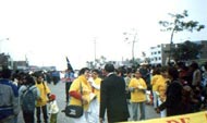 | 我们的队伍 | 市政府官员与大法学员交谈 | 在父亲怀中参加游行的八个月的娃娃 |