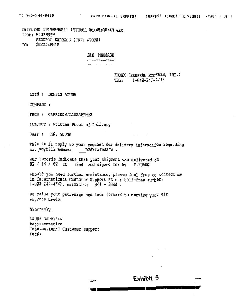 | 联邦快递(Fedex)成功递送邮件的证明 | 原告律师Terri Marsh邮寄时联邦快递(Fedex)的回执 |
