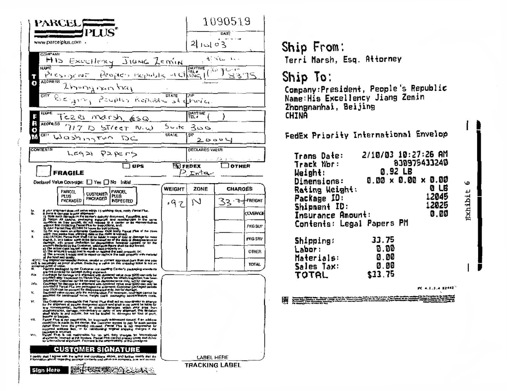2002年12月13日,一份由法庭书记员签发的中英文安排开庭时间的通知书,一封解释该通知书的中英文信函,以及诉状、传票和准许原告用替代送达方式向被告送达法律文件的法庭令的副本,通过联邦特快专递,送交被告江在中国北京中南海的官方办公室。上述文件于2002年12月18日下午3点33分在中南海的信邮地址由黄先生(T. Huang)当场正式签收。