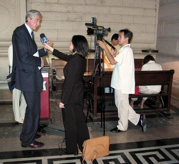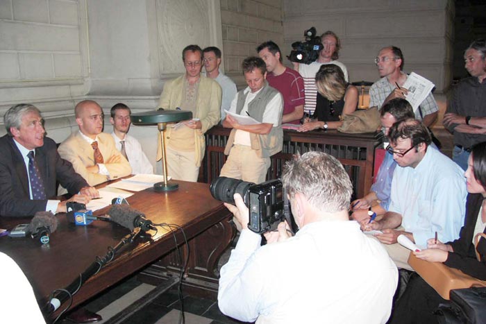 【明慧网2003年8月22日】2003年8月20日上午11时,法轮功学员与著名人权律师乔治-亨利.波梯埃先生(Georges-Henri Beauthier)在布鲁塞尔的司法大厦(Palace of Justice),正式向法院提交控告江泽民诉讼状,并联合举行了新闻发表会。
