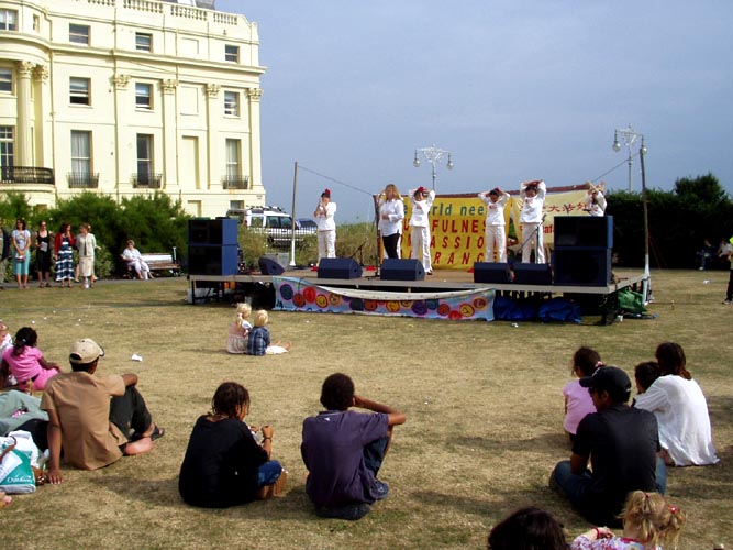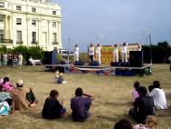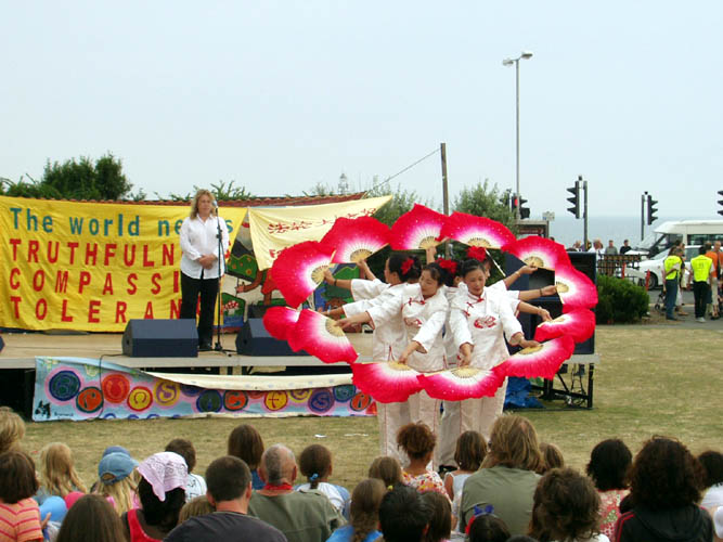 下午三点半左右,轮到大法弟子们的节目了。学员们首先将两面横幅挂在台上,一面写着“世界需要真、善、忍”,另一面写着“法轮大法好”。一位西人学员在台上作了简单的介绍后,学员们开始表演第一个节目——扇子舞“数点梅花天地春”,接着,在台上作了功法表演,一位西人学员同时向观众介绍法轮功,以及法轮功在国内遭受的迫害,和江××被告上美国联邦法庭的正义之举。最后,在一台“法轮大法好”的扇子舞中,学员们结束了长达30多分钟的表演。