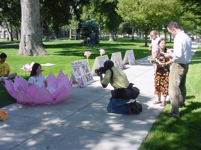 在盐湖城,沙漠新闻报(Desert News) 是当地主要媒体之一;记者刚开始对学员的到访不是太感兴趣。学员本着讲清真象、救度众生的心态,向这位记者讲述了美国公民在中国如何被非法关押和遭到残酷的迫害。学员并以在二战中犹太人遭到希特勒的迫害为例,讲述了在中国江XX对法轮功的迫害之残酷比起希特勒对犹太人的迫害是有过之而无不及。学员还告诉记者,汽车之旅就是要让更多的人了解这些事实,呼吁有善心和正义的人们一起营救美国公民和制止这场在中国的镇压。听到这里,记者深深地被感动了。他特意请来专业摄影师,为学员拍照,还表示:“谢谢你们的努力。我们每个人都应该为这事努力。”随后这两位记者和摄影师在他们的日程已经排得很满的情况下,继续跟着学员,还拍了很多学员炼功的的照片。最后在营救李祥春的签名板上签了名才离去。