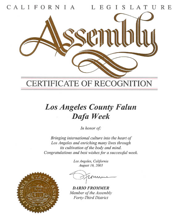加州议会第43选区议员褒奖洛杉矶县法轮大法周