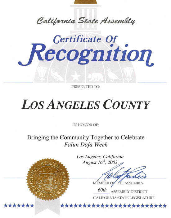 为表彰洛杉矶县让社区一起来庆祝法轮大法周