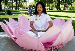 林楚琴(Lin-Chu Qinn)在市郡大楼外的一个大莲花上打坐,莲花象征着纯洁。法轮功学员们希望民众关注目前被关押在中国的美国公民查尔斯.李。