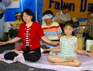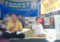 8月24日星期天,一位老先生一大早就来到我们的摊位拿材料并主动签名。学员们的功法示范也吸引了不少游人驻足观看。他们说:“看,他们真祥和。”有的人还当场要求学功。