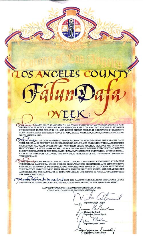 因此,洛杉矶县监事会宣布2003年8月9日至16日为“洛杉矶县法轮大法周”。