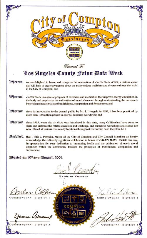 我,康普顿市市长埃里克.皮诺丁(Eric J. Perrodin)和市议会成员特此嘉许法轮大法周这一重要的文化活动,感谢你们专心致力于以真善忍原则在社区内促进健康和修炼个人的道德品质。