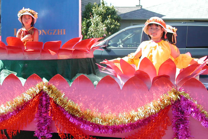 | 法轮功团体的游行队伍前锋 | 花车上的小弟子 |