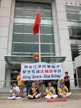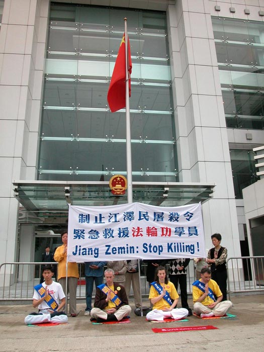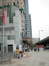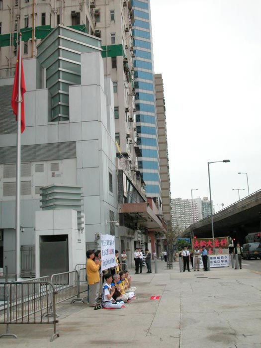 四名来自瑞士的法轮功学员与十二名香港法轮功学员于二零零二年三月十四日早上在中联办前门请愿全景