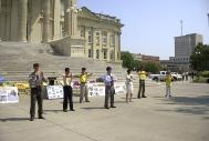 【明慧网2003年8月31日】二零零三年八月二十六日上午,“营救李祥春跨美汽车之旅”的西线和南线学员在堪萨斯州的州政府托皮卡会合后,与当地学员在州政府办公大楼前举办了新闻发布会并且演示五套功法。WIBW 13 电视台到场采访了学员并于当晚报导了李祥春受虐待及中国迫害法轮功的概况。学员们还给过往行人讲清真相和派发传单。