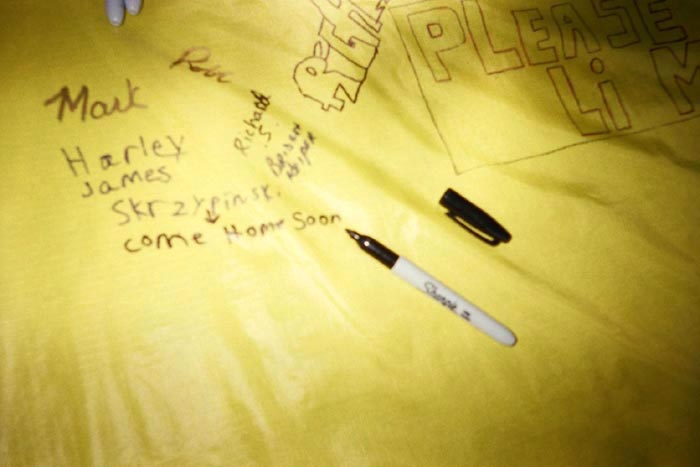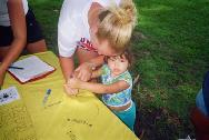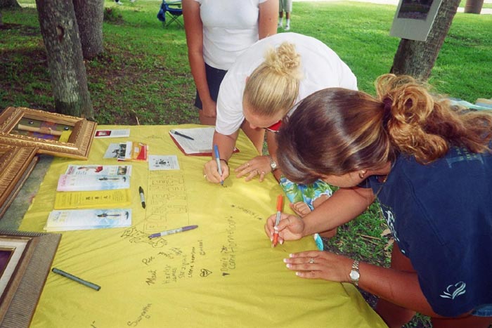 我们在野炊营地附近架起了展板,并开始向人们讲述李梅子被关押,以及法轮功在中国受迫害的真相。我们鼓励人们在请愿信或是在呼吁释放李梅子的一个黄色大横幅上签名。各种职务的消防员和警察前来了解迫害真相,并签上他们的名字以表示他们的支持。他们的家属包括警察的子女也签了名。一名在这天早先已签过名的少年又返回来添上了几句。他写道:“早日回家”。学员们深受感动。