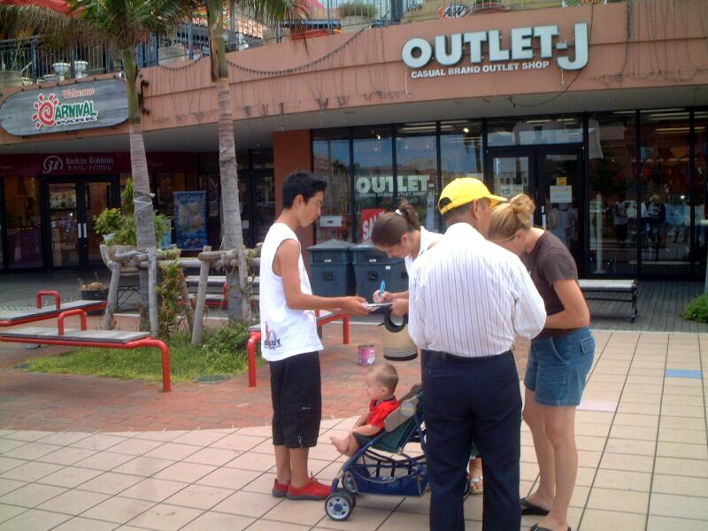 那天,我们又同时在那霸市和冲绳市内搞了签名活动。第二天,在冲绳市的观光名胜“美国村”征签。盛夏的冲绳酷热异常,在烈日下的几个小时,其痛苦真是令人难以忍受。然而,一个中学生大法弟子在艰苦情况下忘我地讲着真象,四处奔波征集签名。这两天里,共征集了800多个签名。