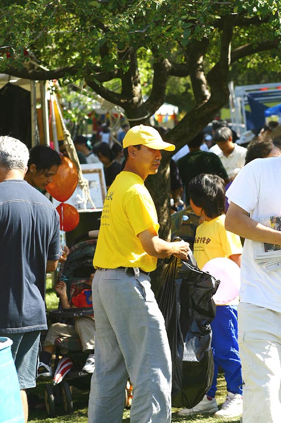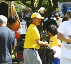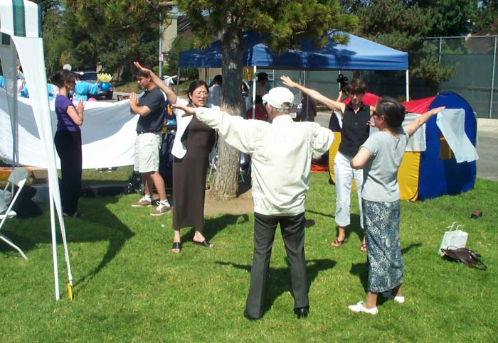 | 示范功法 | 观看表演的观众络绎不绝 | 随处可见的法轮功义工队 |
