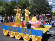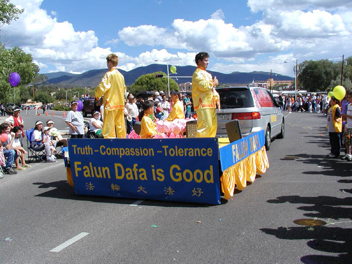 九月七日,科罗拉多和新墨西哥州大法弟子参加了桑特菲(SANTA FE)大游行。这次游行采用了科罗拉多第二代花车设计,花车光彩夺目,设计新颖。花车上中西裔大法学员不停地演示法轮功功法,花车四周装饰了“法轮大法好”“真善忍”横幅标语。