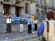 【明慧网2003年9月11日】“营救李祥春跨美汽车之旅”9月9日抵达新泽西州,汽车之旅成员、新泽西州热心营救李祥春的人士和当地法轮功学员在新州纽瓦克(Newark) 市府大楼前和川顿市(Trenton) 的州议会大楼前举办了两场新闻发布会。