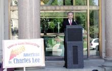 艾伦-爱德乐先生在川顿市州议会大楼前发言陈刚在纽瓦克市新闻发布会发言符泳青在纽瓦克市新闻发布会发言