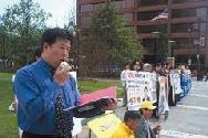因炼法轮功在北京遭劳教18个月、今年7月18日才被释放的陈刚(左一)在会中控诉中共的迫害,20位法轮功学员在一旁高举标语或打坐练功。