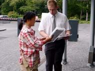 一位在总统府工作的老警察对我们说,这种形式真好,不用多说什么,江××怎么坏,人们全都知道得一清二楚了。还有一些警察主动问:法轮功究竟是什么?为什么中国要如此残酷地迫害呢?听了我们的讲解之后,他们都说:谢谢。这些警察下班后,他们又主动来索要文字资料。