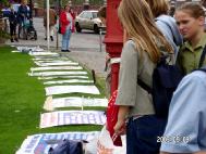 总统府前有个公共汽车站,很多人为了观看图片半个小时,甚至错过几趟车。与图片展同时进行的还有对面马路的30多个标语展。对面马路的过客同样感到了制止这场疯狂迫害的紧迫性。这场史无前例的镇压导致上千名信仰真善忍的无辜好人死于酷刑,10万人非法关押在劳教所,就因为他们要求自己道德高尚,这是要毁灭人类的基本人性的大事。曾经有位德国人说:我只读了两个标语我就决定签字了。