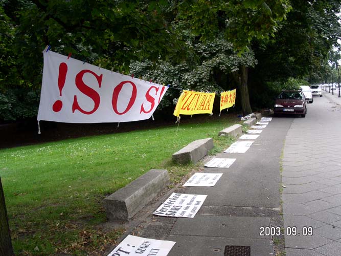 那两幅大型标语是用英语和德语制成的:“紧急呼吁各国政府和媒体立即制止中国国家恐怖主义对法轮功学员的迫害。”