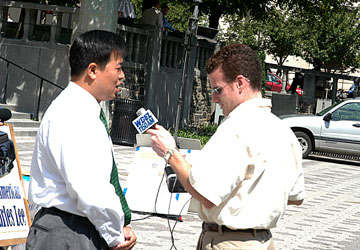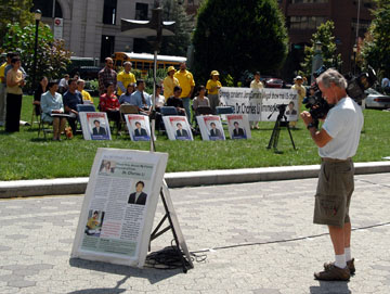 特拉华州威明顿市议员THEOPALIS GREGORY 主持新闻发布会威明顿市电视台前来采访报导法轮功学员炼功
