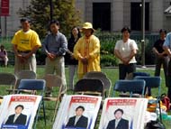 法轮功学员冒着雨在新闻发布会前后演示了功法。当天有许多路人惊闻美籍法轮功学员李祥春被非法关押在中国。许多路人都纷纷签名支持请愿。他们也踊跃地接受我们发的真象传单。