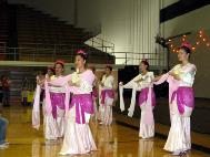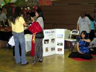 学员们根据传统的音乐“春江花月夜”编排了舞蹈,翩翩舞姿和飘逸挥舞的彩带吸引了全场的目光和掌声。一位女学员还表演了独舞“东方鱼美人”和“孔雀舞”。人们都惊叹法轮功学员的多才多艺。最后,包括七十多岁的老年弟子和十几岁的小弟子在内的十位学员在上台表演了优美、舒展的法轮功五套功法,向观众传达任何年龄的人都适合炼法轮功的信息。随着师父的口令,弟子们整齐的演示着功法,整个大厅都充满着祥和的气氛。许多人都接过我们的资料,还有人询问在哪里可以学到法轮功。工作人员还要求与学员们合影留念。
