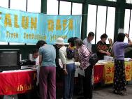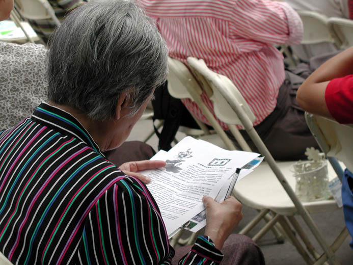 | 法轮功学员的腰鼓表演 | 陈汝棠一家演奏“莲花颂”和“普度” | 接受真相材料后的华人在阅读材料 |