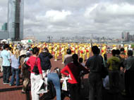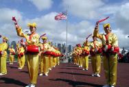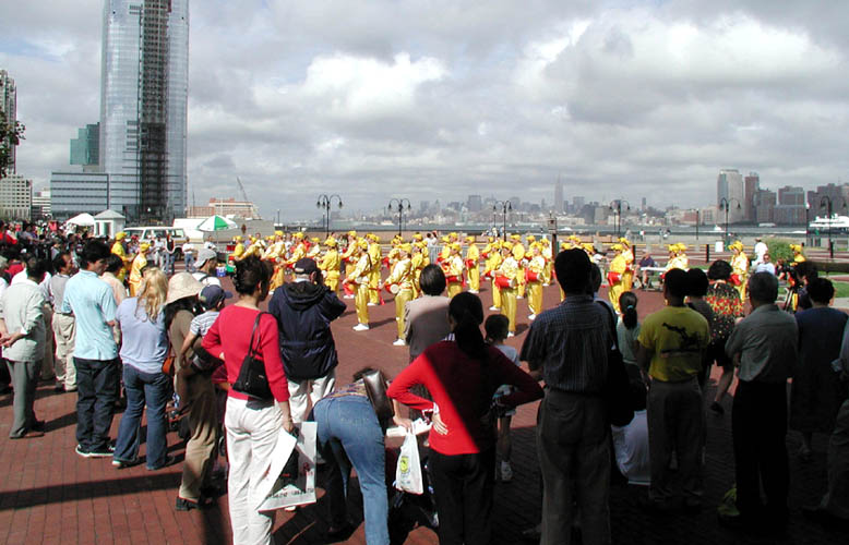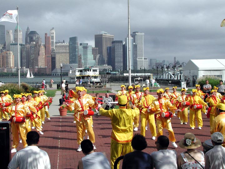 除了舞台表演,法轮功学员还主动向组委会申请作大型腰鼓表演。几十名来自新泽西和纽约地区的法轮功学员特意编排了新的腰鼓动作,反复演练。“新州中国日”当天,几十位腰鼓队员身着亮丽的黄色炼功服,在对岸曼哈顿的背景下进行了精彩的腰鼓表演。伴随着“法轮大法好”的歌声,学员们灿烂的笑容、整齐优美的击鼓动作赢得了在场观众的高度赞赏,大法修炼者的美好的精神面貌再一次给当地华人留下了深刻印象。