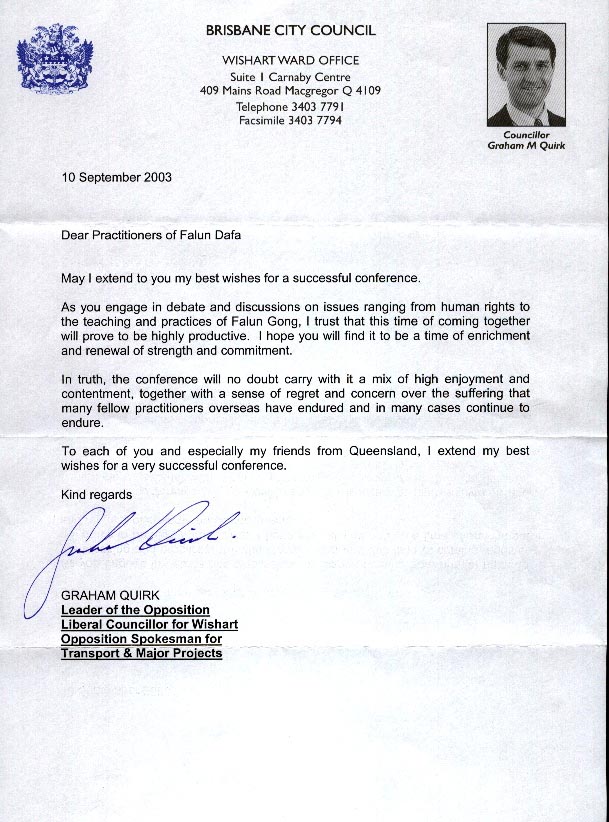 工党领袖、交通和重大项目发言人奎克(Graham Quirk)在贺信中说,“在你们为人权和法轮功的修炼准则而努力奋斗的时候,我相信在这样时刻相聚在一起将会很有收获。我希望你们会从中汲取更多并获得新的力量投入你们的努力。事实上,这次心得交流会无疑既包含着满足和幸福,也有着遗憾和关注,为着你们那些海外的同修们曾经经受过的苦难和许多正在承受痛苦的同修。让我问候每一个参会的朋友……祝交流会圆满成功。”