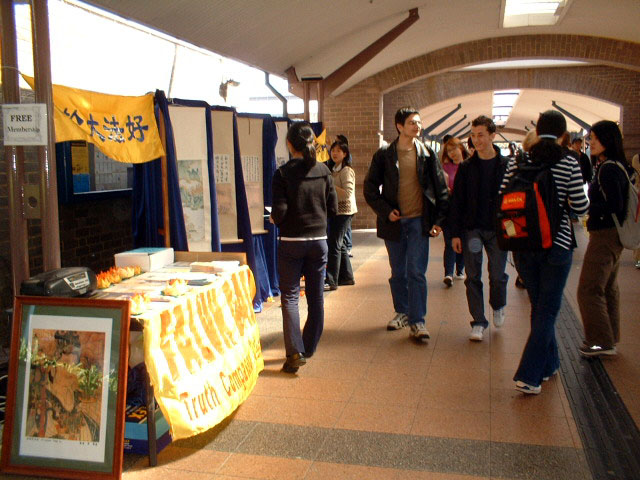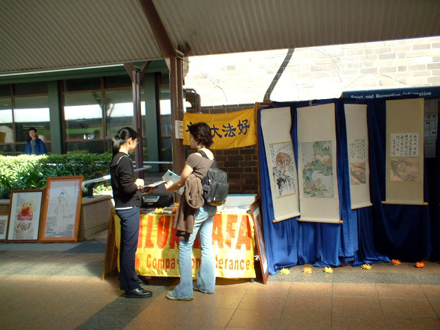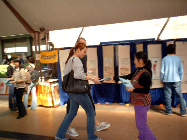 人们好奇地问为什么要展览这些作品,当他们听到画的作者章翠英女士曾因严重的关节炎一度失去作画的能力,是法轮功使她恢复了健康,得以重新施展艺术才华,却为了给法轮功说句公道话而在中国受到严重迫害的遭遇后,都感到不可思议并深感气愤,纷纷取走了法轮功的相关材料。也有不少人表示对法轮功功法感兴趣,还有的想拜读《转法轮》。