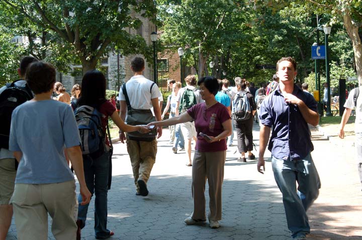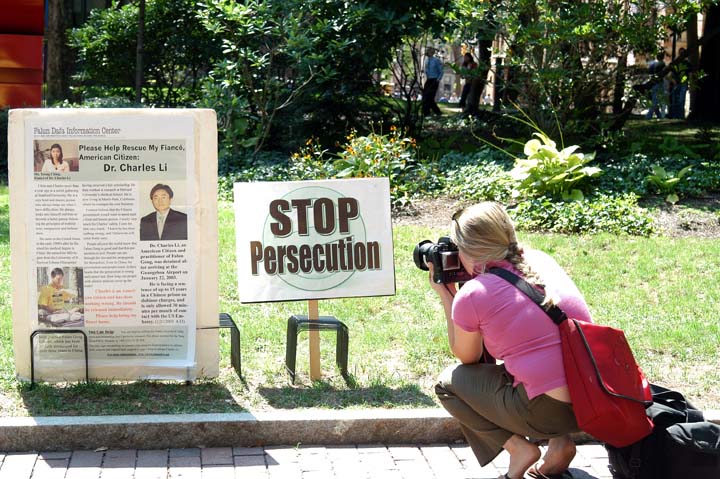 【明慧网2003年9月19日】中午位于费城的宾夕法尼亚大学校园的LOCUST人行道上,来来往往的人群总是川流不息,有刚下课的,也有正要去上课的学生和老师。9月11日那天出奇地好,人行道旁的爱心公园一组静静打坐的人,以及“营救美国公民李祥春”的横幅展板,吸引了过往行人驻足观看,很多人主动签字呼吁释放因传播法轮功真相而在中国被非法关押的李祥春医生。宾夕法尼亚大学校报的记者和摄影师也前来采访报导。