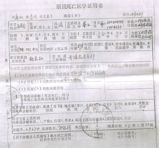赵英奇在2002年12月30日送去医院当天已经死亡,大夫两次通知送太平间,因家属意见不统一没送,结果死亡通知书上却写2003年1月2日晚8点零二分死亡。赵英奇被迫害致死的消息在明慧网上发表后,劳教所所长王勇敬带一干恶警找到其家人进行威逼、恐吓,真是打死人还不许说,置国法于不顾。