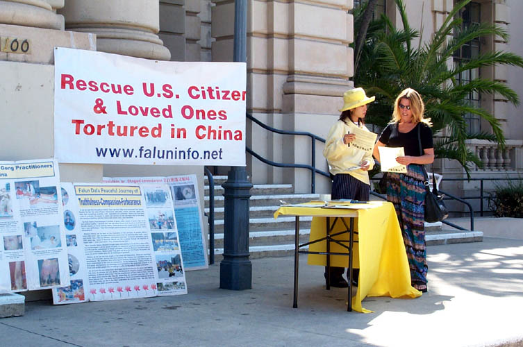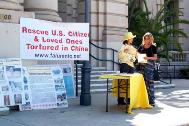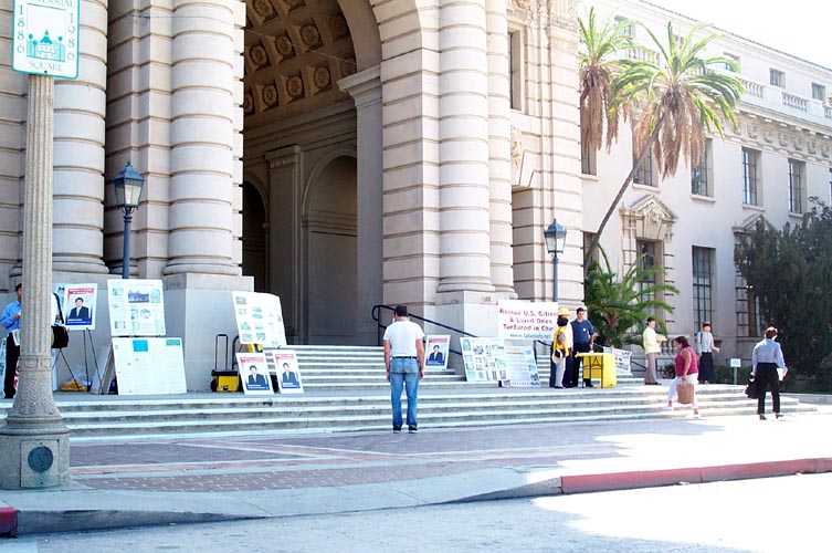 【明慧网2003年9月20日】为营救在中国被江氏集团非法关押的法轮功学员李祥春,洛杉矶法轮功学员于18日上下午分别于帕萨迪纳市与阿汉布拉市市政厅门前举行新闻发布会。帕萨迪纳市议员保尔-立图(Paul Little)给此次活动发来了支持信。在信中,他呼吁联邦政府尽一切所能,确保李医生被释放,并保证他的安全。