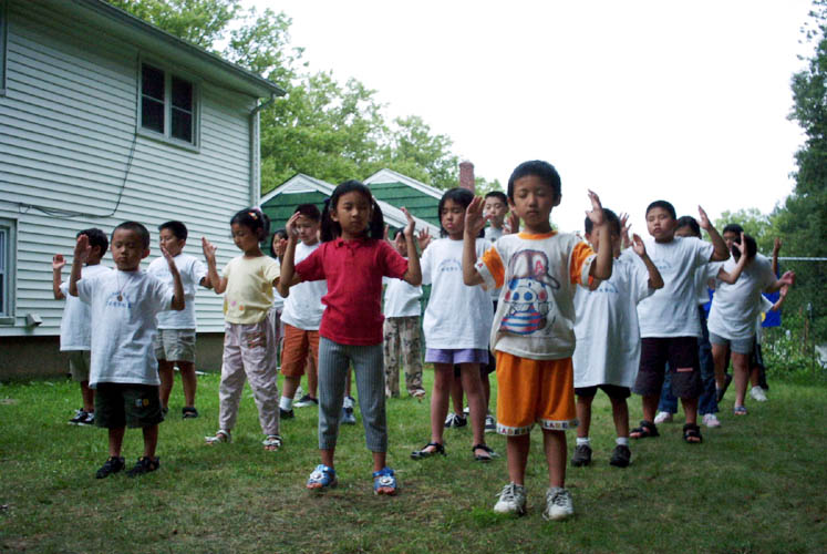 我们坚持每天一小时的集体炼功。对已学会五套功法的孩子,要求其动作准确,在炼功时不要受周围环境的影响,闭上眼睛,倾听音乐,专心炼功。对初学的孩子,采取个别教功的办法,要求他们动作要基本到位。所以,在夏令营期间,所有的孩子都能在集体炼功时伴随着大法的音乐,按照师父的口令,较整齐地完成五套功法。