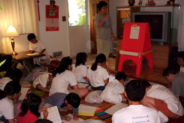 第一次参加夏令营的人数有15名,年龄从5岁至13岁不等。第二次人数增加到27名,而且年龄跨度较大,从4岁到14岁不等。年龄的差别、修炼状态的差异(近一半的孩子属于刚得法),加之语言的不同(有的孩子只讲英文,有的只讲中文,有的只讲广东话),而我们又没有分班的可能性。面对这一现实,我们抛弃了常人那种年龄的差异、文化程度的悬殊、修炼层次的不同,而我们又毫无经验的观念,相信师父和大法,视每个孩子为自己的孩子,充分利用这一环境,在每期只有短短的四天时间内,在只有两至三个学员老师的情况下,坚持每天六至七个小时的集体学法、炼功、发正念,并注重引导孩子们在实际生活中以法指导自己的一言一行。我们以师父讲的学员每天必须做的三件事为宗旨,并注意培养孩子们的整体意识观念。我们是这样做的: