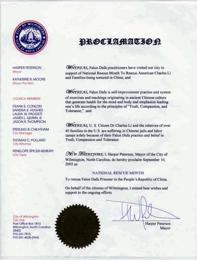 鉴此,我,北卡州威明顿(Wilmington)市市长,宣布2003年9月16日为威明顿市