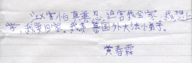 恶警孙立忠用手掐住小春霖的脖子将其提起,并说:“你不说就不放你下来,别以为你是小孩儿就拿你没办法。你不说就不放你回家……”