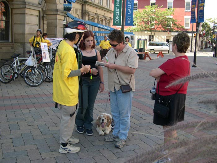 在那坡尼市,当学员在市政府前炼功时,一群10来岁的小孩在周围静静地观察和欣赏优美的功法。这时,一个成年人过来有意挑衅,小孩们马上围过来对学员表示支持。其中一个说,我看了你们的展板,64岁的老人因炼功被关押,这太令人气愤了。