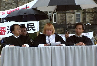 国会外交委员会副主席斯铎克维尔-德维(Stockwell Day)到场的法轮功学员在炼功模拟审判法官