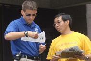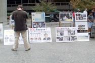 不时也有行人前来观看询问。一位女警察详细询问了此次活动的目的。当一学员给她看北京便衣警察在天安门广场上、在众目睽睽之下,将利刃放在被踩在脚下的法轮功学员的脖子上的图片时,她极为惊讶。临走时,她拿走了真相光盘和其它一些真相材料,并表示将把这些材料与她的同事分享。