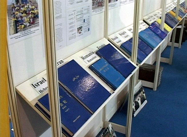 其中法轮大法书籍的展位展出了被翻译成各国文字的法轮大法书籍。包括中文、英文、日文、朝鲜文、越南文、西班牙文、泰文、印尼文、等等三十多种。由于中国目前正在迫害法轮功,所以这个展位在书展中显得很特别。来往的人们都索取有关法轮功真相的资料,热心的咨询相关内容。不少人专注地观看法轮大法在各地弘扬和在中国被迫害的图片。到印尼旅游的大陆游客,也有到展位观看各种资料的。