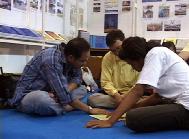 展出翻译成各国文字的法轮大法著作约三十多个版本 想知道法轮功多一些,干脆坐下来问。 小弟子在演示功法。