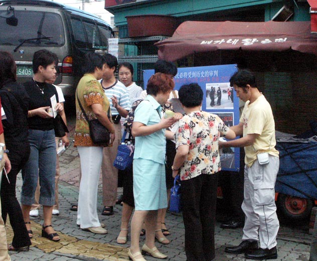 【明慧网2003年9月6日】8月31日下午,在汉城新村区厅火车站前,部分汉城大法弟子面向广大市民及各国游客,分别用中文和韩文揭露邪恶之首江泽民及其