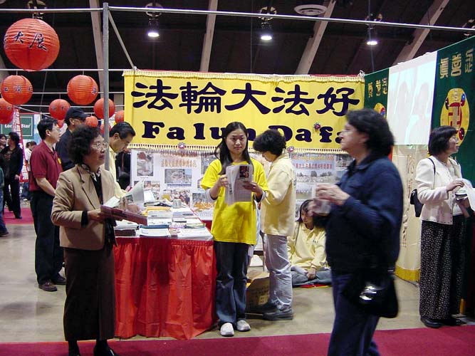 法轮功学员在展览大厅摊位展示五套功法、发送讲清真象传单资料、展售大法书籍。吸引络绎不绝的群众前往。